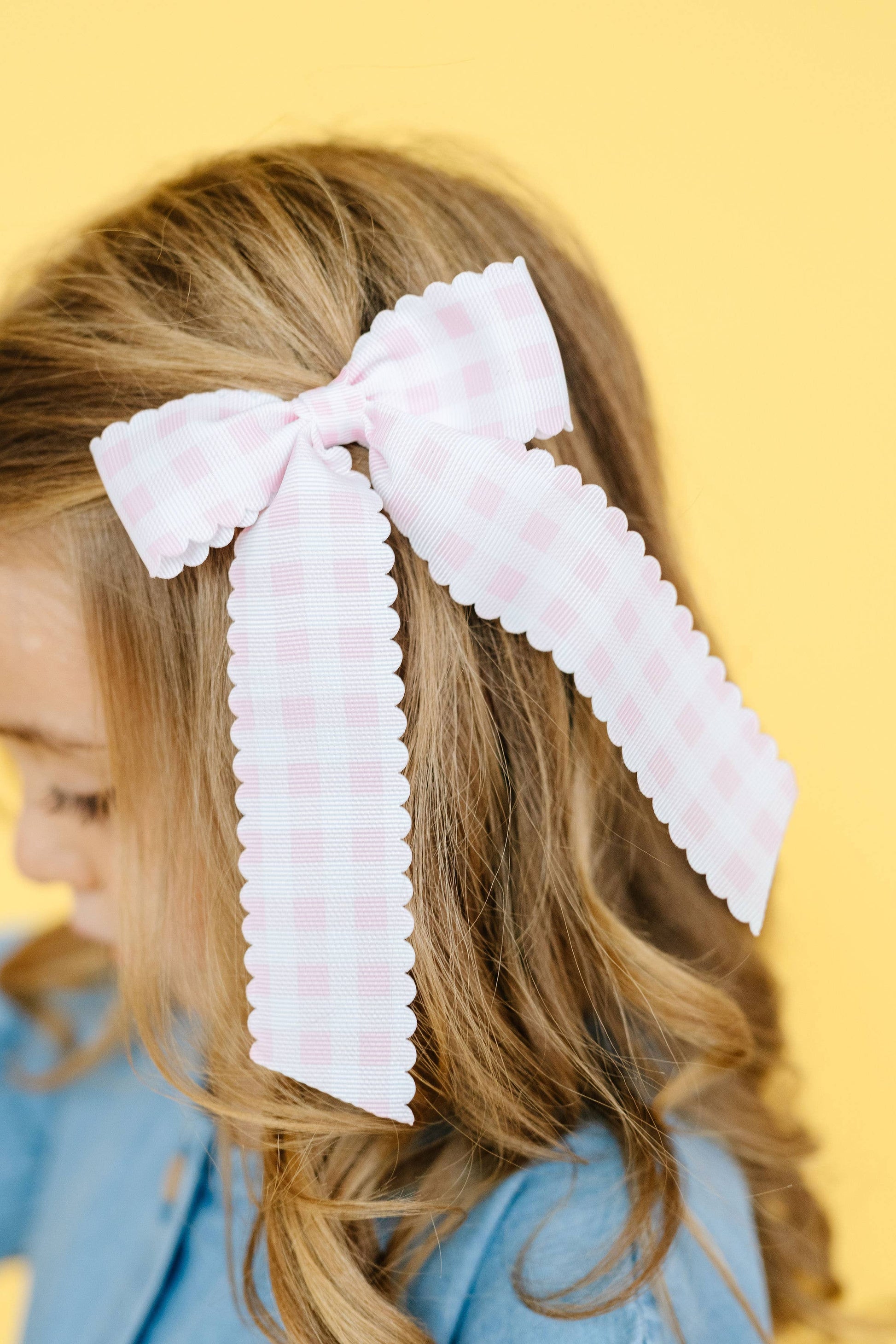 Gingham long-tail bow is approximately 4 inches wide and 8 inches tall.