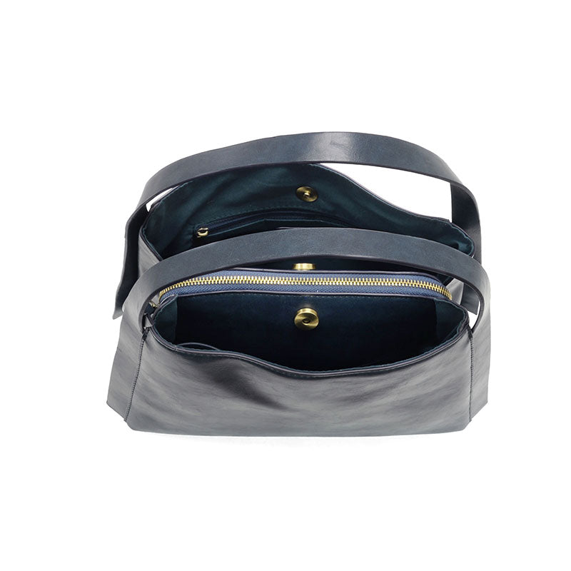 This polished satchel crafted in glossy vegan leather will elevate your daily style. Equipped with three distinct inner compartments; a center zip compartment and two open compartments with magnetic snap closures, this bag will keep you organized with ease. Equipped with demure top handles and a detachable, adjustable shoulder strap, you have multiple carry options to compliment your look.