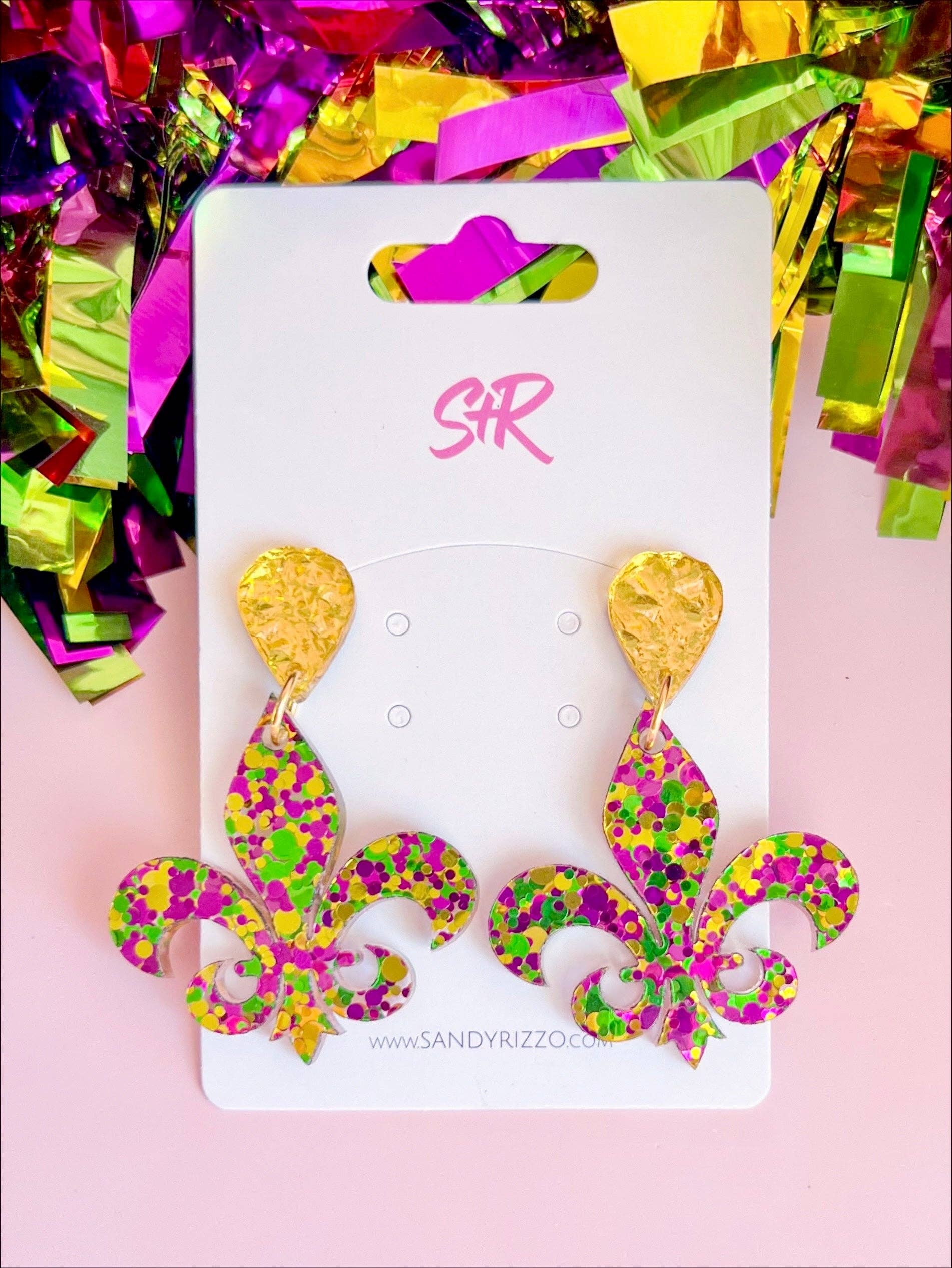 Celebrate the spirit of Mardi Gras with this stunning Large Fleur de Lis dangle! This eye-catching earring features a teardrop-shaped gold lamé top that catches the light beautifully, flowing into a dazzling fleur de lis design adorned with shimmering purple, green, and gold glitter!
