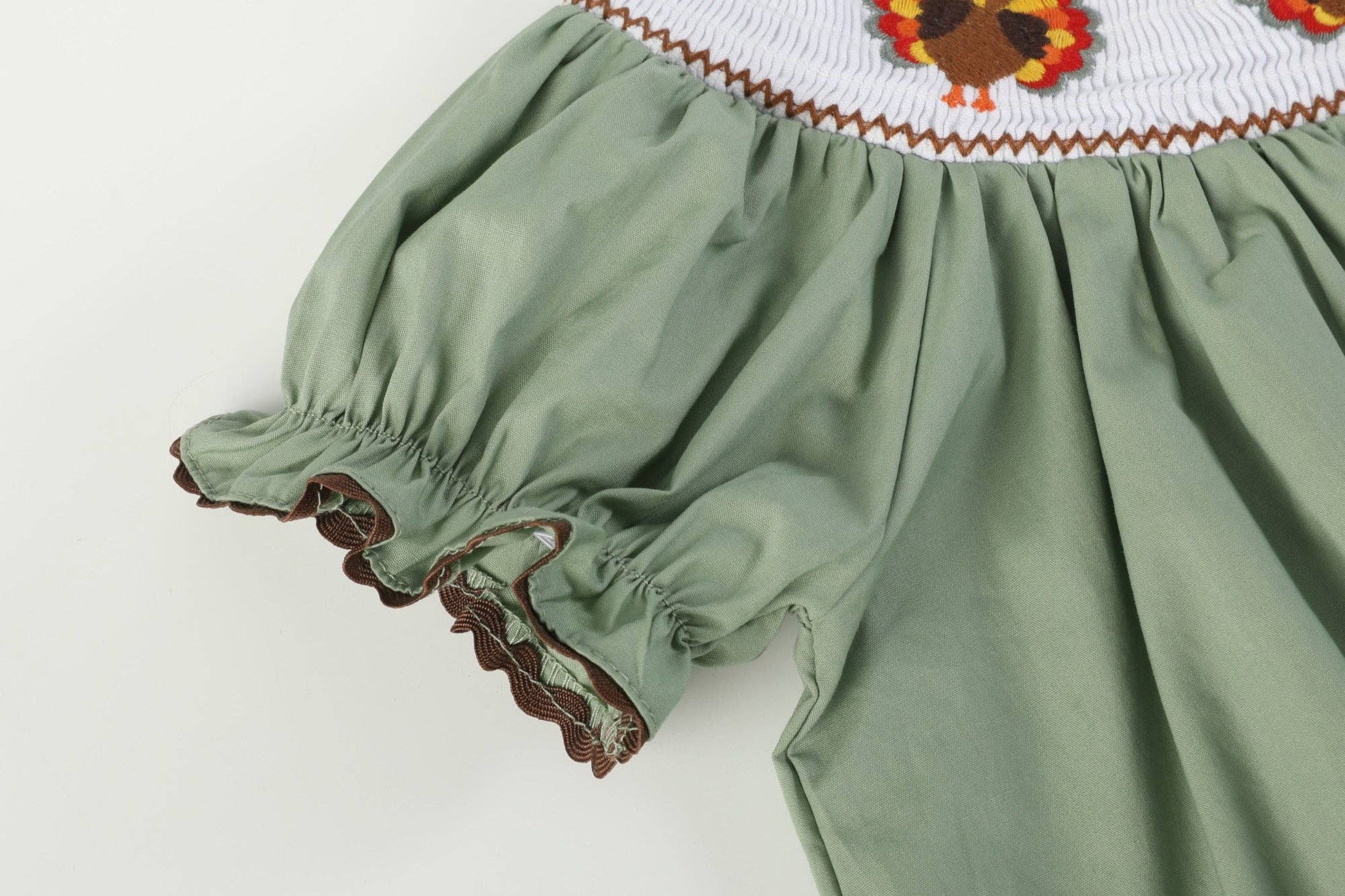 Capture the spirit of Thanksgiving with our Sage Green Turkey Smocked Bishop Dress. This enchanting ensemble features a beautifully smocked neckline adorned with delicately embroidered turkeys, adding a festive touch to your little girl's celebration. The soft sage green hue evokes the warmth of autumn, making it a perfect choice for creating cherished memories during this season of gratitude and joy.
