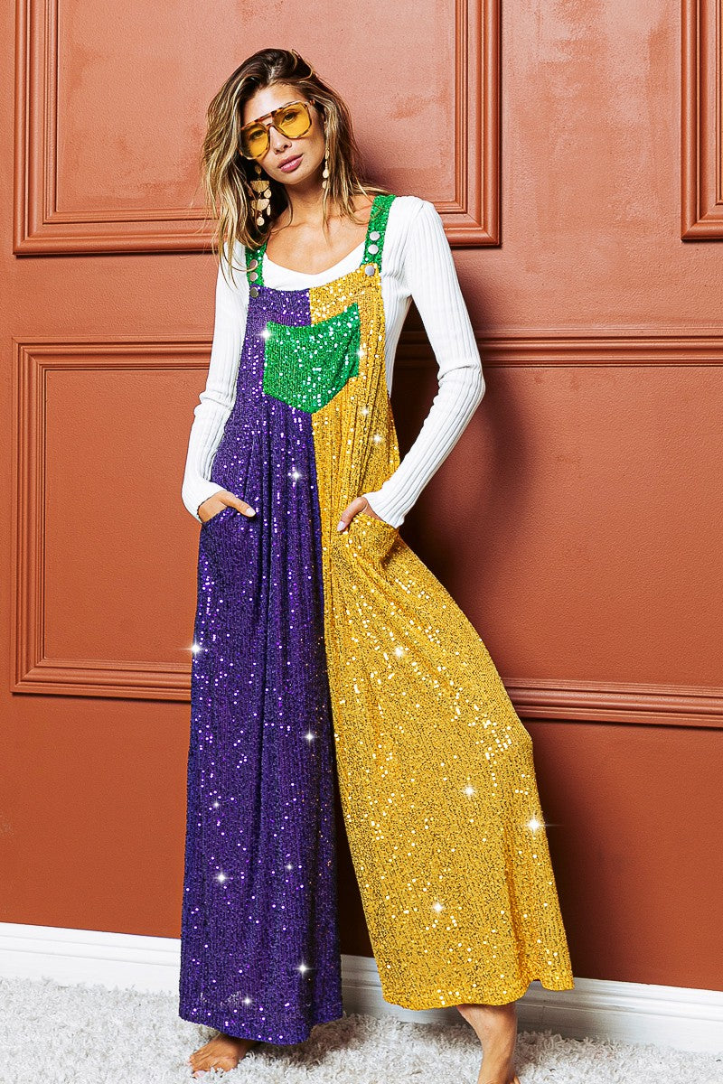 Get ready to shine at your next Mardi Gras celebration with our Sequin Mardi Gras Overalls! These overalls are covered in colorful sequins, making you stand out in the crowd. Perfect for dancing and partying all night long, these overalls will add a touch of fun and sparkle to your outfit!